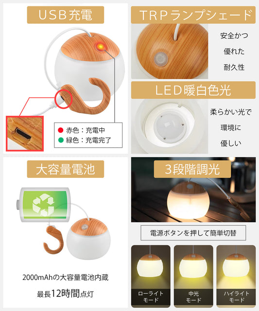 ランタン キャンプ 木目調 フック 明るさ調整 USB充電 シリコン 長時間点灯 屋内 屋外 ベッドライト 車中泊